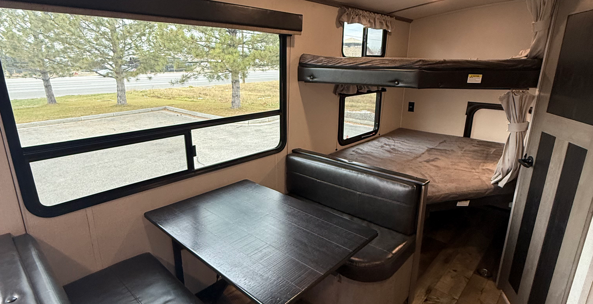 Sleeping Layout: Front queen bed, rear bunks, convertible dinette